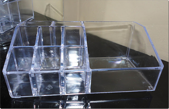Organizador de acrílico com 6 espaços para batons, 2 espaços para pinceis, corretivos, delineadores e etc, um espaçogrande ideal para quartetos de sombras, bases em pó, blush e bronzer, por R$24,00